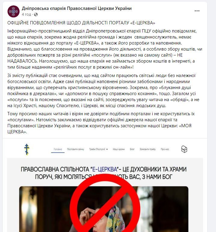 Як виявилося, ПЦУ дійсно не має нічого спільного з цим порталом. Представники Дніпровської Єпархії ПЦУ заперечили свою причетність до надання будь-яких послуг в "Є-Церкві".