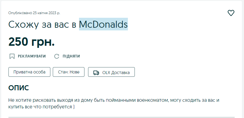 Не хочете ризикувати, виходячи з дому, бути спійманими військкоматом, можу сходити за вас і купити все, що потрібно, - йдеться у оголошенні на ОЛХ.