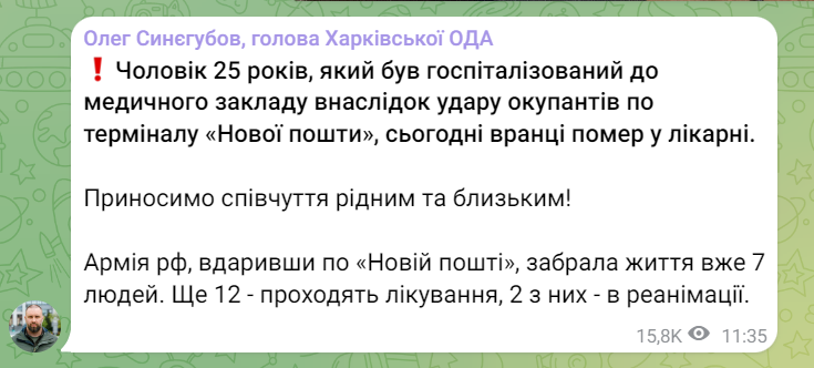 Сьогодні вранці у лікарні помер 25-річний хлопець, який отримав поранення внаслідок удару окупантів по терміналу «Нової пошти» в селі Коротич у Харківській області.