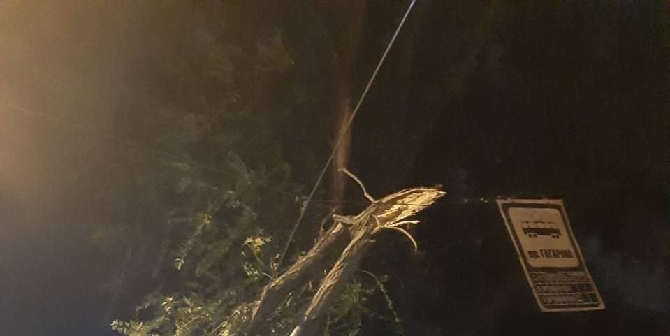 На дротах тролейбусу валяються гілки. Комунальники вже почали роботу по ліквідації наслідків негоди.