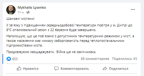 Шановні містяни! У зв‘язку з підвищенням середньодобової температури повітря у м. Дніпрі до 8°C опалювальний сезон з 22 березня буде завершено. Наголошую, що це пов‘язано з допустимим температурним режимом у місті, а також населення має чималу заборгованість перед теплопостачальними підприємствами міста. Продовжуємо заощаджувати. Війна ще не закінчилась, - написав він.