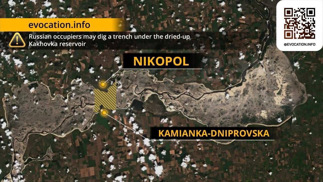 Повідомляється, що висохле Каховське водосховище перетворилося на пустир та сіру зону після підриву ГЕС росіянами. І нібито росіяни риють підкоп та споруджують окопи й траншеї в бік Нікополя, до якого 4 кілометри "напряму" з окупованої Кам'янки-Дніпровки.