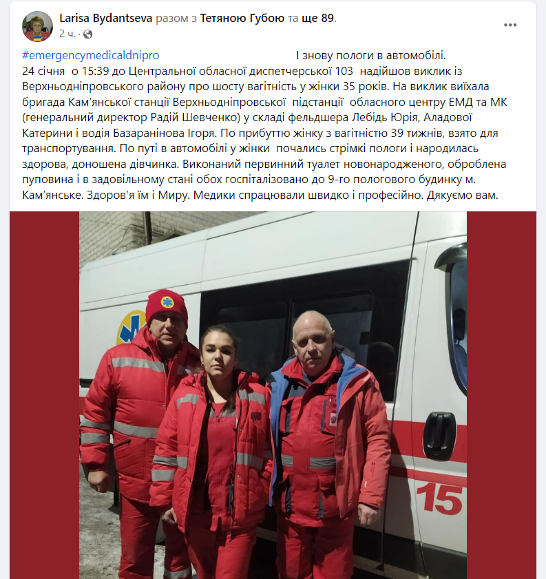Так, 24 січня о 15:39 на лінію «103» надійшов виклик із Верхньодніпровського району про шосту вагітність у 35-річної жінки. На виклик виїхала "швидка".