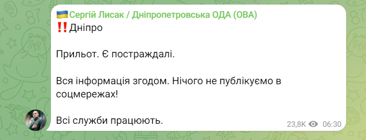 Дніпро. Прильот. Є постраждалі. Вся інформація згодом. Нічого не публікуємо в соцмережах! Всі служби працюють, - написав він.