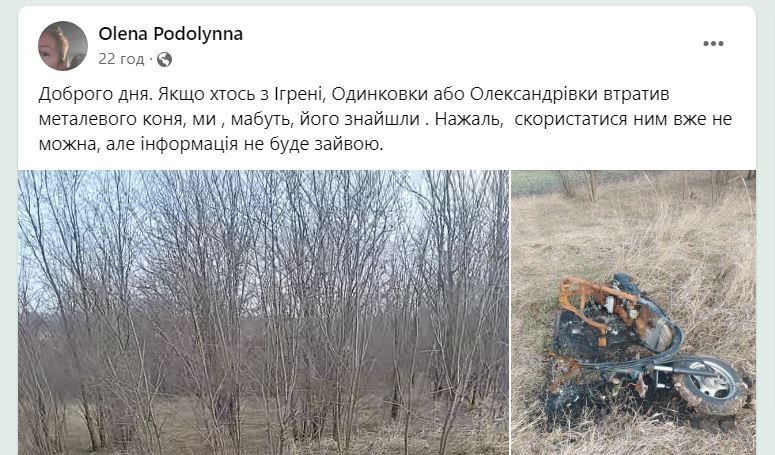 Доброго дня. Якщо хтось з Ігрені, Одинковки або Олександрівки втратив металевого коня, ми, мабуть, його знайшли. На жаль, скористатися ним вже не можна, але інформація не буде зайвою, - зазначила жінка у дописі.