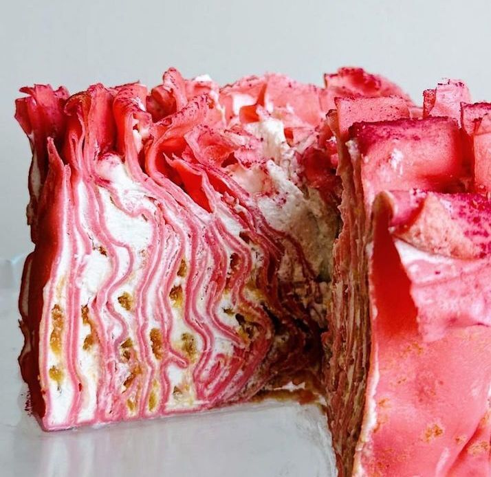 У ресторані МЯО можна спробувати одразу два незвичайні десерти. Перший – це японський торт із рожевих млинців, крему із зеленого чаю та шоколаду, а всередині начинка з джему із персика. Десерт своїм виглядом нагадує екзотичну квітку.
