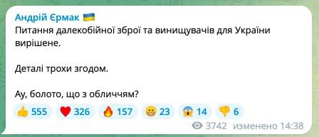 Питання далекобійної зброї та винищувачів для України вирішене. Деталі трохи згодом. Ау, болото, що з обличчям? - йдеться в повідомленні.