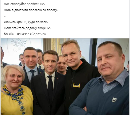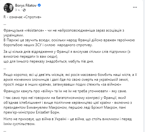 R - означає «Спротив». Французьке «résistance» - чи не найрозповсюдженіша зараз асоціація з українцями. У Парижі це звучить всюди, оскільки народ Франції дійсно вражений героїчною боротьбою наших ЗСУ і силою народного спротиву. За ці кілька днів відрядження у Франції я вислухав стільки слів підтримки (з вимогою передати їх вам сюди), що для їхнього переказу знадобиться, мабуть, пів дня, - написав Борис Філатов.