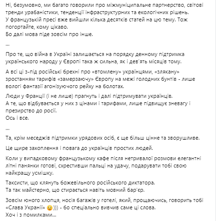 Ми багато говорили про міжмуніципальне партнерство, світові тренди урбаністики, тенденції інфраструктурних та екологічних рішень. У французькій пресі вже вийшли кілька десятків статей на цю тему. Тож погортайте, кому цікаво. Бо далі мова піде зовсім про інше. Про те, що війна в Україні залишається на порядку денному, підтримка українського народу у Європі така ж сильна, як і дев’ять місяців тому. А всі ці з-під російські брехні про «втомлену» українцями, «злякану» зростанням тарифів «замерзаючу» Європу на межі голодних бунтів - лише вологі фантазії агонізуючого рейху на болотах. Люди у Франції (і не лише) прагнуть і далі підтримувати українців. А те, що відбувається у них з цінами і тарифами, лише підвищує зневагу і презирство до росії. Ось і все, - написав Борис Філатов.