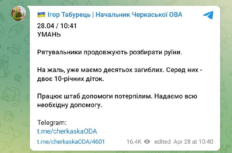 В Умані Черкаської області російська ракета влучила у багатоповерхівку. На жаль, уже відомо про 10 загиблих, серед них - двоє 10-річних діток.