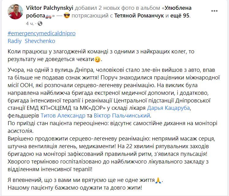 До приїзду швидкої вони робили чоловіку непрямий масаж серця. Фельдшери, які прибули на місце виклику, ще майже півгодини проводили серцево-легеневу реанімацію, доки в містянина не з'явився пульс.
