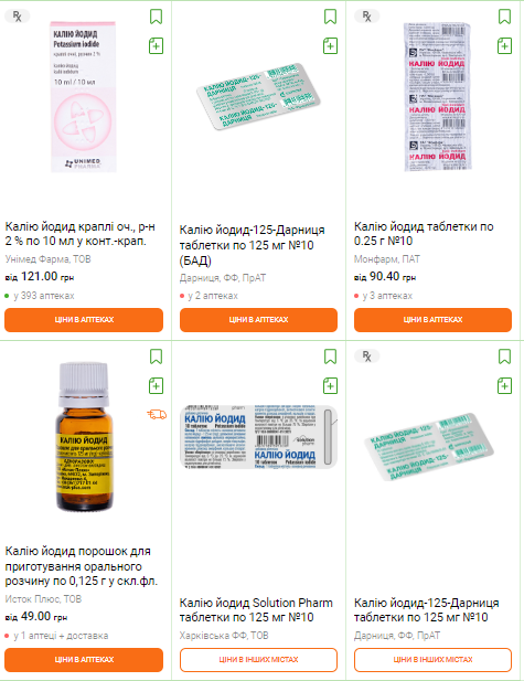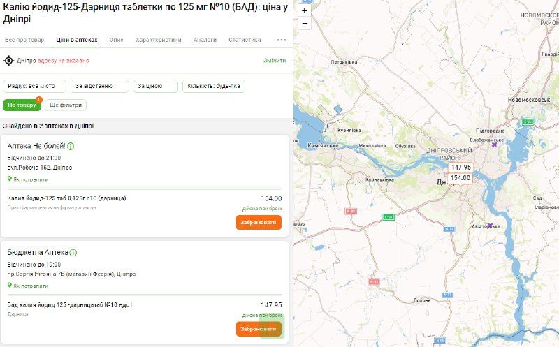 Проте якщо ви захочете замовити "таблетки Йодид калію Дарниця по 125 мг №10 (БАД)", клікнувши на них, ви побачите, що вони в наявності тільки в двох аптеках міста.