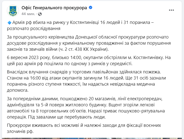 Оновлено 7 вересня об 11:45: у МВС повідомили, що, за уточненою інформацією, кількість загиблих внаслідок удару по Костянтинівці – 16 осіб. Це встановили після огляду тіл. Отримали поранення 33 особи. Наразі тіла майже всіх загиблих ідентифіковані. Не ідентифікували тіло лише одного чоловіка.
