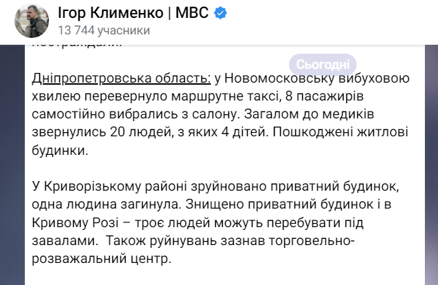 Додамо, за інформацією Ігоря Клименка, міністра внутрішніх справ, у Кривому Розі знищено приватний будинок – троє людей можуть перебувати під завалами.