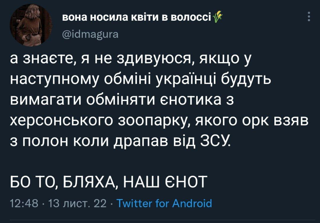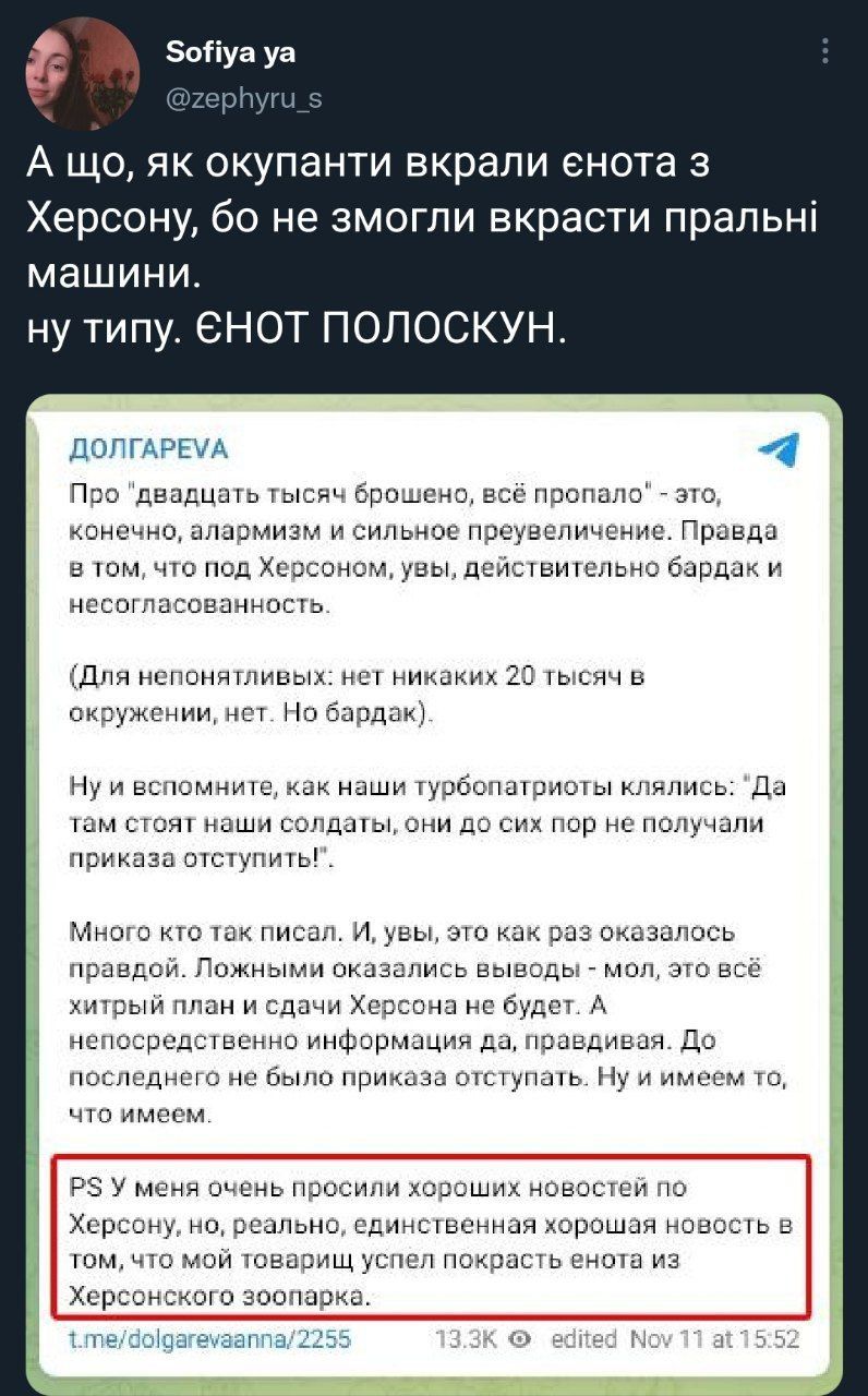 Варто уточнити, що єнота із зоопарку Херсона вкрав не просто якийсь дурний солдат, а саме російське командування. У Крим вони вивезли більшу частину колекції зоопарку : від лами і вовка до віслюка і білок", – написав він.
