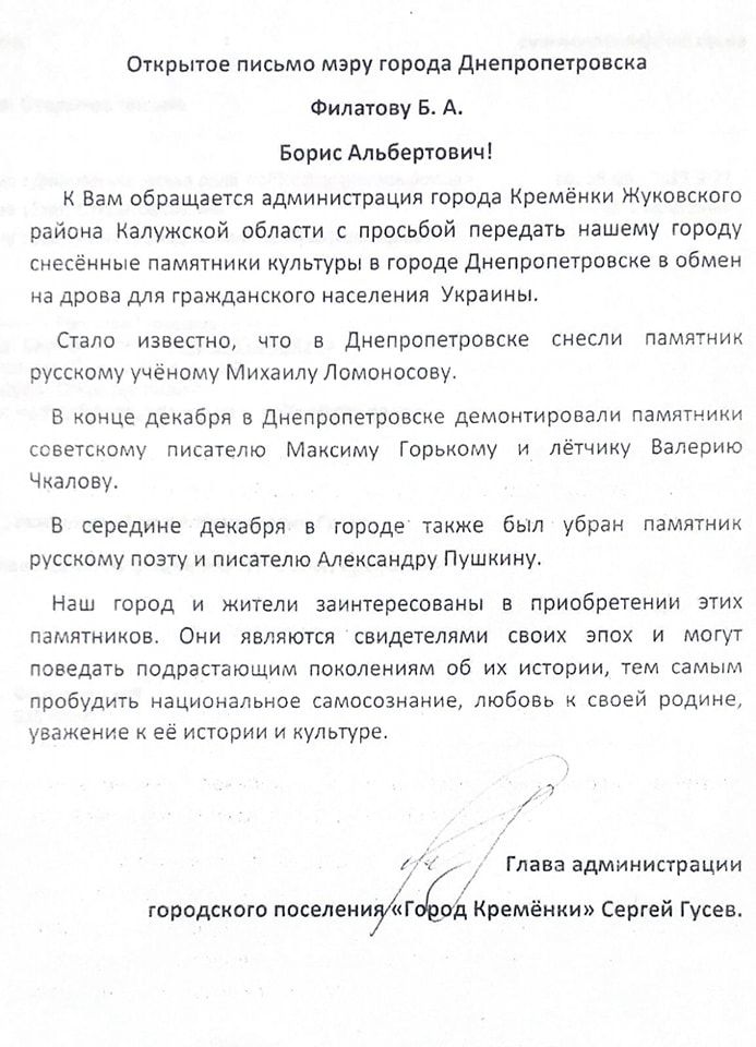 Адміністрація російського міста Кремьонки Калузької області звернулася до мера Дніпра Бориса Філатова з пропозицією забрати демонтовані у місті пам'ятники російським діячам. Натомість громадяни країни-агресорки пропонують надати дніпрянам дрова.