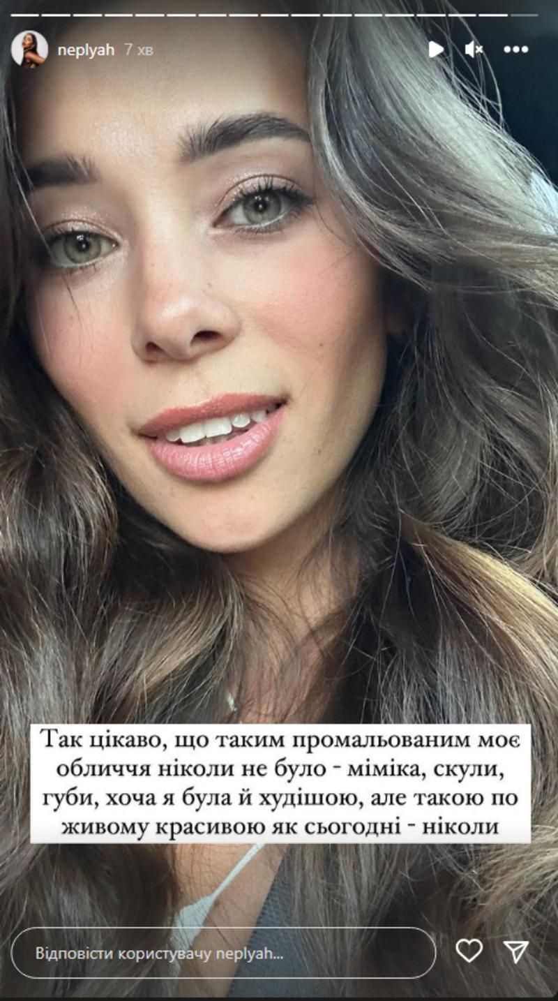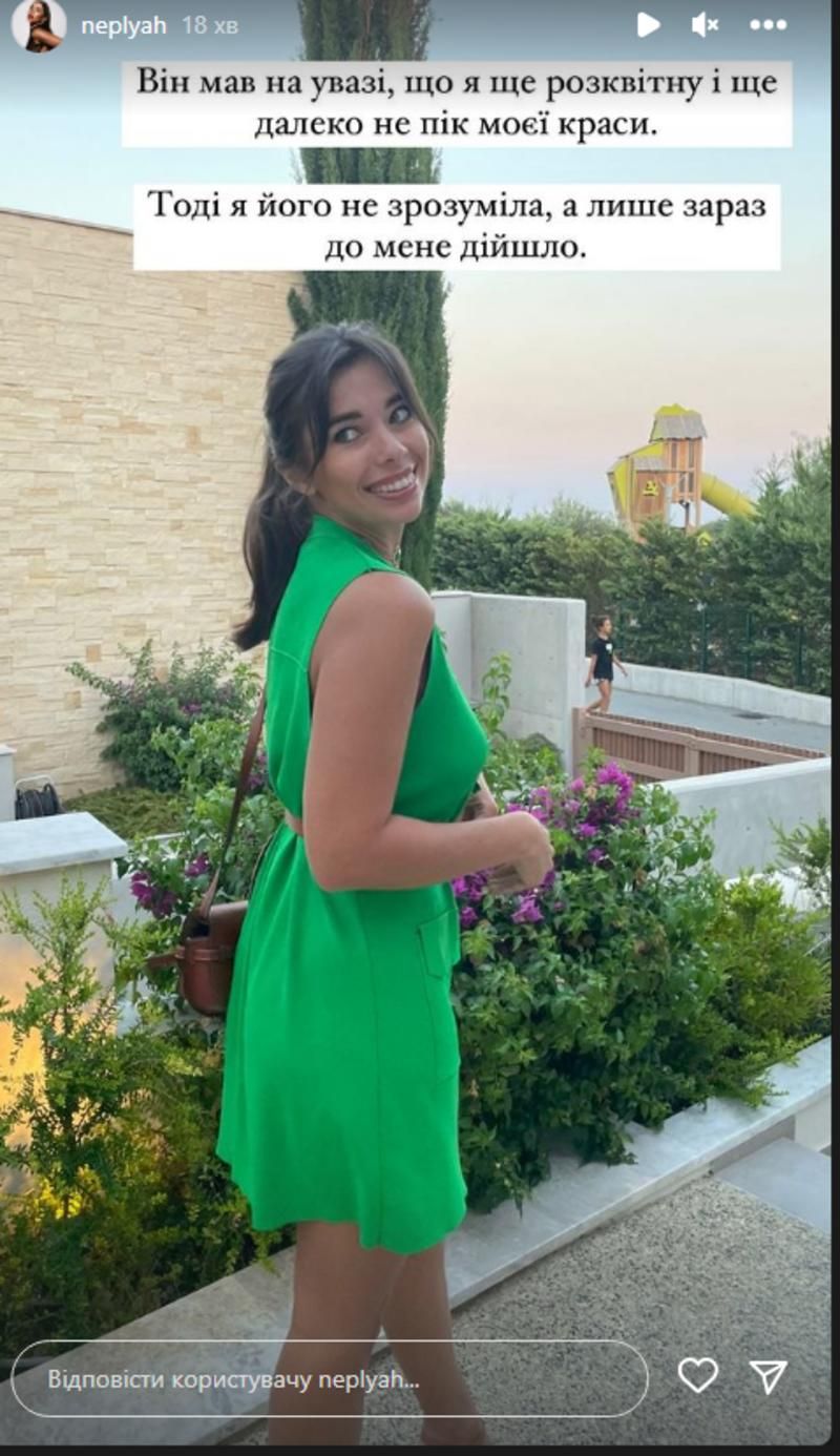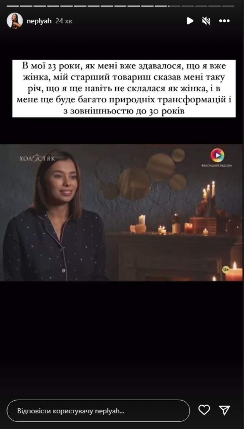 «У мої 23 роки, як мені здавалося, що вже жінка, мій старший товариш сказав мені таку річ, що я ще навіть не склалася як жінка, і мене ще буде багато природних трансформацій із зовнішністю до 30 років. Він мав на увазі, що я ще розквітну і ще далеко не пік моєї краси. Тоді я його не зрозуміла, а лише зараз до мене дійшло», — написала Неплях.