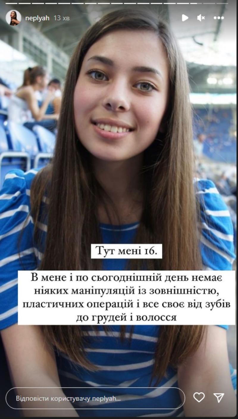 «Тут мені 16. В мене і по сьогоднішній день нема ніяких маніпуляцій із зовнішністю, пластичних тичних операцій і все своє від зубів до грудей і волосся. Та я прекрасно розумію, що далі