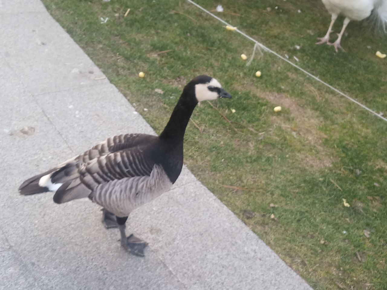 А це казарка білощока - острівний водоплавний птах. В Україні майже не зустрічається, адже зазвичай гніздиться на південному узбережжі Гренландії, у берегів Норвегії та на Південному острові Нової Зеландії. Мігрує через північну Європу, зимуючи в Нідерландах, а на початку холодної пори року "відпочиває" в Німеччині, Бельгії та Франції.