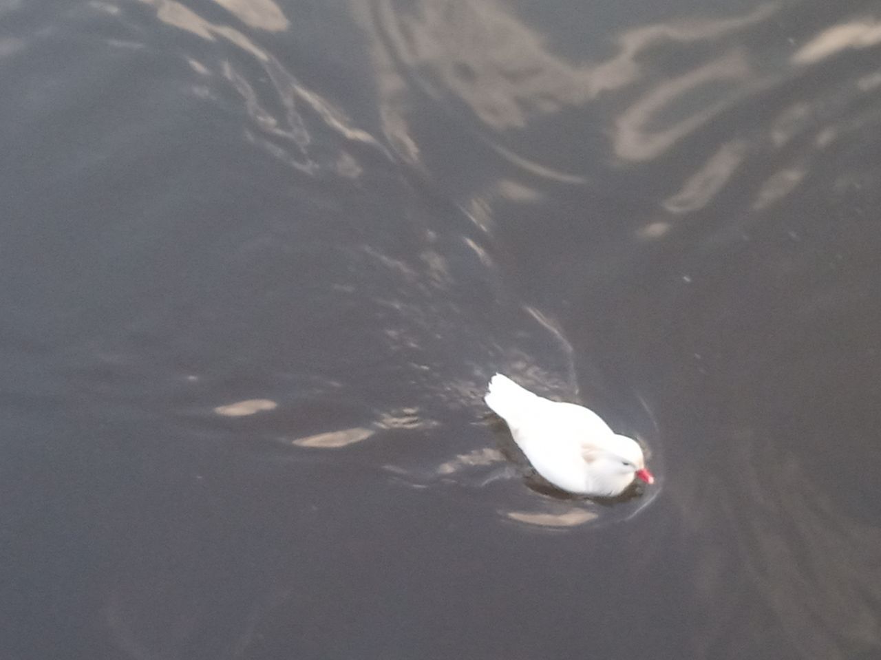 А це качка-мандаринка, але яка має біле пір'я. Здалеку цей птах схожий на папугу.