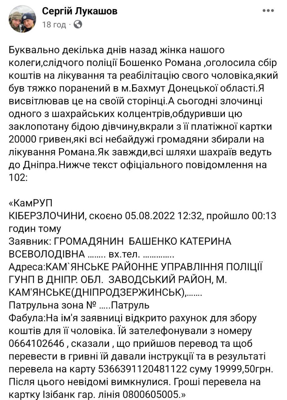 Шахраї з Дніпра вкрали гроші, які збирали на допомогу пораненому поліцейському з Кам'янського.
