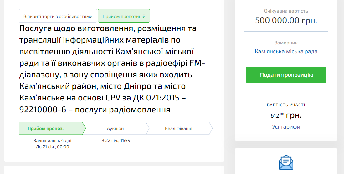 Так, Кам'янська міська рада планує замовити "послугу щодо виготовлення, розміщення та трансляції інформаційних матеріалів по висвітленню діяльності Кам’янської міської ради та її виконавчих органів в радіоефірі FM-діапазону, в зону сповіщення яких входить Кам’янський район, місто Дніпро та місто Кам’янське". Очікувана вартість - 500 000 грн. Наразі триває прийом пропозицій.