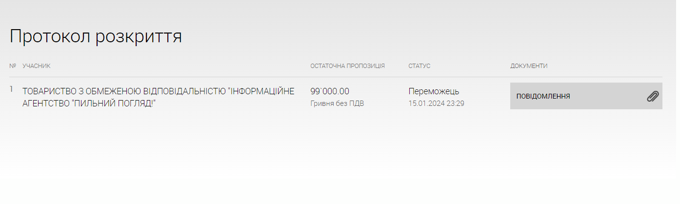 Переможцем обрали вже знайоме ТОВ “Інформаційне агентство “Пильний погляд”.