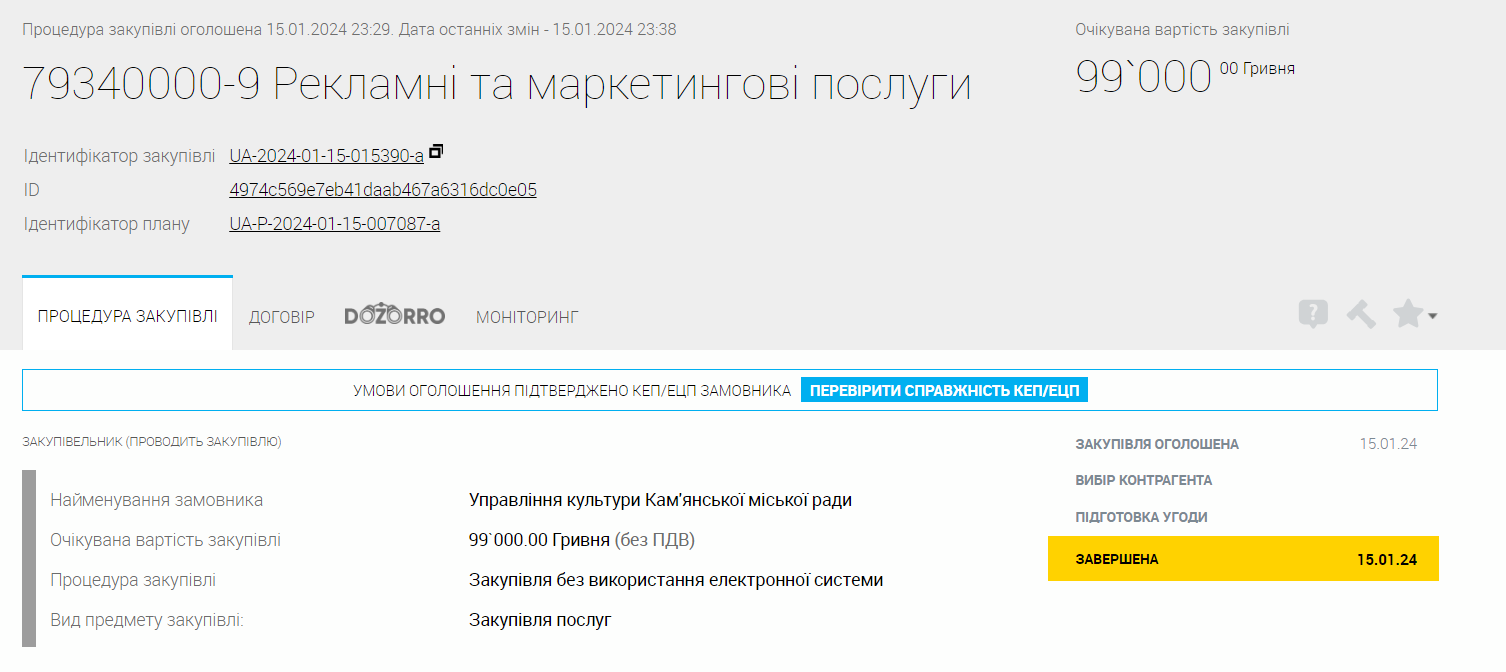 Послуги з "висвітлення діяльності" замовило і управління культури Кам'янської міської ради. Тендер на 99 000 грн було проведено 15 січня. Предмет закупівлі - висвітлення діяльності цього управління в мережі Інтернет.