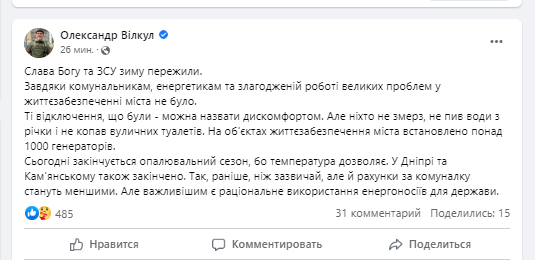 Слава Богу та ЗСУ, зиму пережили. Завдяки комунальникам, енергетикам та злагодженій роботі великих проблем у життєзабезпеченні міста не було. Ті відключення, що були - можна назвати дискомфортом. Але ніхто не змерз, не пив води з річки і не копав вуличних туалетів. На об'єктах життєзабезпечення міста встановлено понад 1000 генераторів. Сьогодні закінчується опалювальний сезон, бо температура дозволяє. У Дніпрі та Кам'янському також закінчено. Так, раніше, ніж зазвичай, але й рахунки за комуналку стануть меншими. Але важливішим є раціональне використання енергоносіїв для держави, - написав Вілкул.