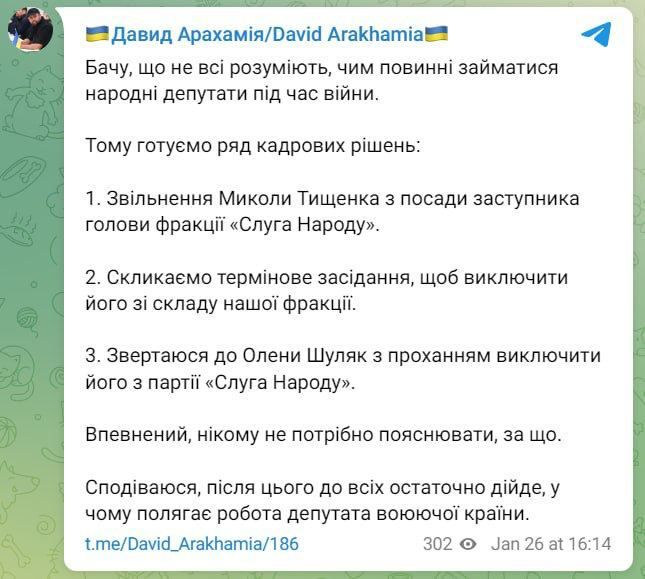 На цей випадок відреагував Давід Арахамія та повідомив про підготовку рішень щодо звільнення Миколи Тищенка з посади заступника голови фракції "Слуга народу", а також виключення його зі складу фракції та партії.