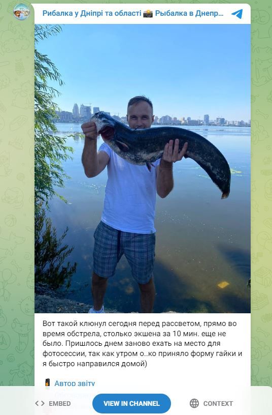 У Дніпрі рибалка вполював у річці великого сомика під час ракетної атаки на місто 15 серпня. За словами чоловіка, перед світанком йому вдалося виловити крупну рибку, саме в той момент, коли пролунали перші вибухи.