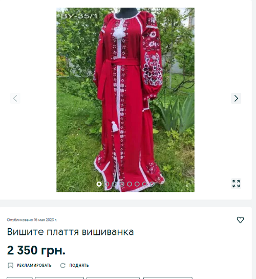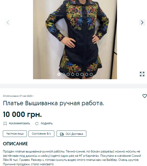 А от сукня яка, як стверджує продавець, була вишита вручну можна купити за 10 тис грн. За словами автора оголошення, сукня одягалася один раз, була куплена в магазині за 16 тис грн. Сукня коротка, чорного кольору з яскравою кольоровою вишивкою.