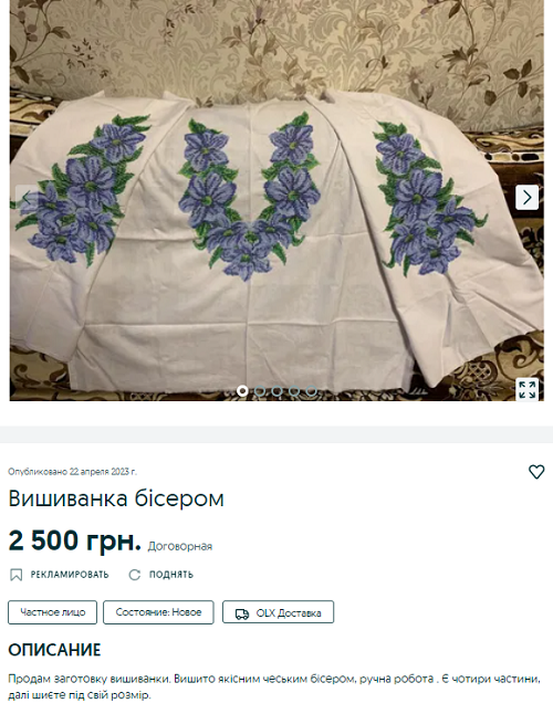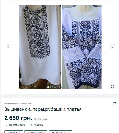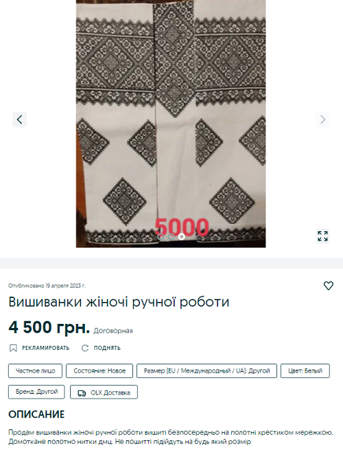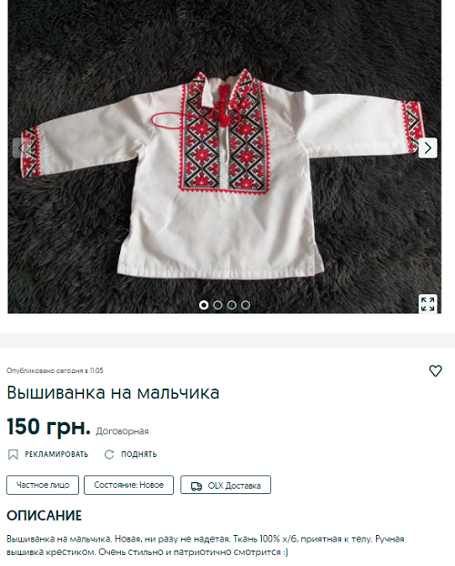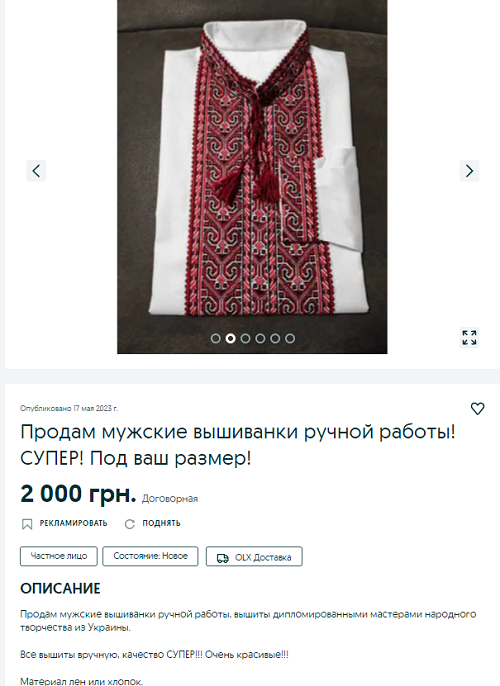Чоловічу вишиту вручну сорочку можна купити за 2 тис. грн. Як стверджує автор оголошення, «сорочка вишита дипломованими майстрами народної творчості»