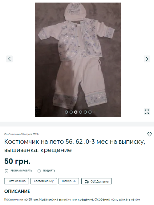 Дитячу вишиванку для хлопчика вишиту вручну можна купити за 150 грн. Як стверджує продавець, одяг жодного разу не одягався, тканина – бавовна. Аналогічна вартість і вишиванки на дівчинку.