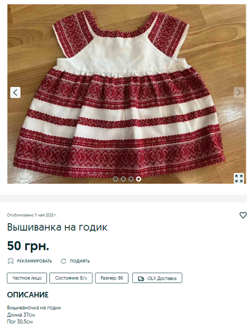 Сукню-вишиванку на однорічну дівчинку можна купити за 50 грн. Її стан «уживаний», але найімовірніше дитина носила її не так часто.