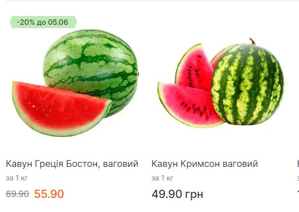 Так, купити кавун можна у “Варусі”. Його ціна стартує від 49 грн за кілограм. Кавун сорту Греція Бостон можна ще купити по акції за 55,90. Звичайна ціна - 69,90.