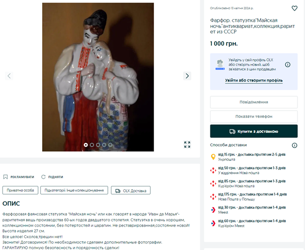 У 1960-х на полицях магазинів з'явилася статуетка «Майська ніч». Без сколів, тріщин, потертостей та подряпин продати таку сьогодні можна за 1000 грн.