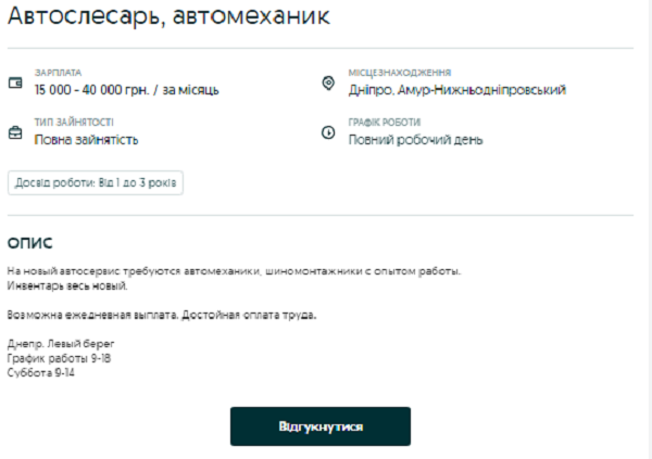 Автомеханік у Дніпрі може заробити від 15 до 40 тис. грн на місяць. Працювати потрібно буде 6 днів на тиждень, у будні з 9 до 18:00, а в суботу – з 9 до 14:00. Можлива щоденна виплата грошей.