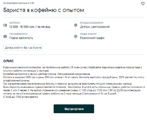 Бариста у кав'ярні у Дніпрі може заробити від 12 до 16 тис грн на місяць. Працювати потрібно буде повний робочий день, здобувачеві необхідно мати досвід роботи не менше 2 місяців. Виплати зарплати відбуваються щодня. За зміну набирається 650 грн плюс чайові. На додаток до оплати праці баристам пропонують безкоштовний обід. Працювати потрібно буде позмінно 2/2 чи 3/3 дні. Під час роботи у вечірні зміни є компенсація таксі.