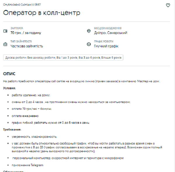 Оператор кол-центру у Дніпрі може заробити 70 грн за годину роботи. Повна сума за день залежатиме від кількості годинників. Робота віддалена, змінна – по 2 та 4 години. Весь цей час потрібно бути за комп'ютером. Зміни припадають на час від 8 до 20 години дня. Можливий один повний вихідний на тиждень.