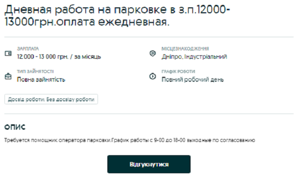 Оператор паркування у Дніпрі може заробити від 12 до 13 тис грн на місяць. Працювати потрібно буде з 9-ї ранку до 18:00. Вихідні за погодженням. Платити обіцяють щодня.