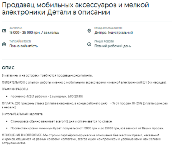 Продавець мобільних аксесуарів у Дніпрі на день може заробити від 200 грн плюс відсоток від продажу. За місяць за підрахунками роботодавця виходить від 15 до 25 тис. грн. Працювати потрібно позмінно, 4 дні, а після – 2 дні вихідних. Графік роботи з 9:00 до 20:30. Співробітнику потрібно буде консультувати покупців за товарами та їх характеристиками, вести звітність, клеїти захисне скло та плівку на телефони, розкладати товар на вітрині.