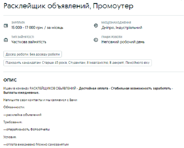 Розклеювач оголошень у Дніпрі на місяць може заробити від 15 до 17 тис грн. Працювати потрібно буде не повний робочий день, за підсумками надавати роботодавцю звіти про виконану роботу. Клеїти оголошення потрібно оперативно. Оплату обіцяють щоденну.