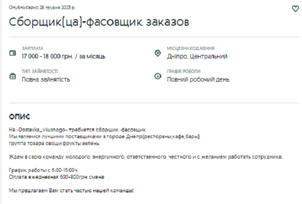 Складальник та фасувальник замовлень може заробити від 17 до 18 тис грн на місяць. Щодня за зміну збирач отримуватиме від 600 до 900 грн. Працювати потрібно з 6:00 до 15:00. Фасувати потрібно буде овочі, зелень та фрукти.