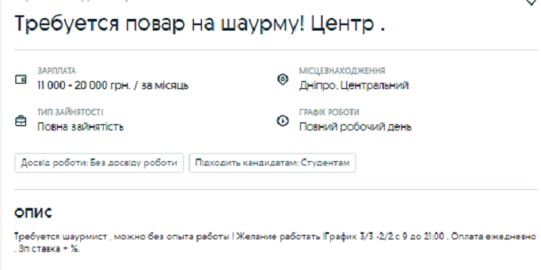 Кухар, який вміє готувати шаурму, може заробити в Дніпрі від 11 до 20 тис грн. Працювати потрібно буде цілий день, з 9-ї ранку до 21:00 вечора. Досвід роботи не потрібен, потрібне лише бажання. Оплата щоденна і складається зі ставки та відсотка від продажу. Графік роботи 2/2 чи 3/3 дні.