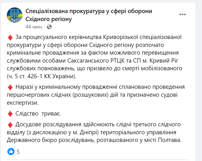 Пізніше стало відомо, що за процесуального керівництва Криворізької спеціалізованої прокуратури розпочато кримінальне провадження за фактом можливого перевищення службовими особами Саксаганського РТЦК та СП м. Кривий Ріг службових повноважень, що призвело до смерті мобілізованого (ч. 5 ст. 426-1 КК України).