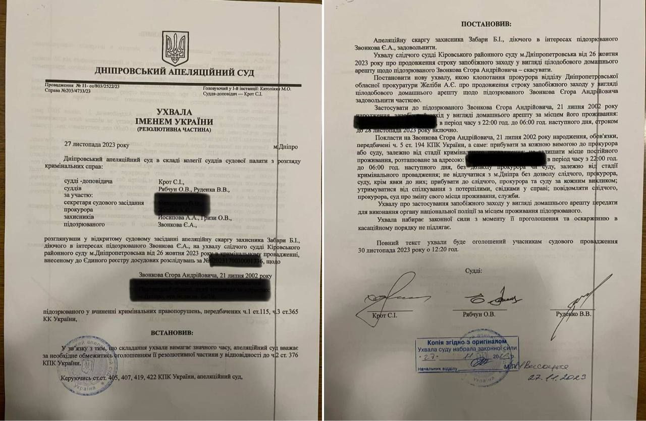 Апеляційну скаргу захисника Забари Б. І., діючого в інтересах підозрюваного, задовольнити. Застосувати до підозрюваного Звонкова Єгора запобіжний захід у вигляді домашнього арешту в період з 22:00 до 06:00 до 28 листопада включно, - йдеться у рішенні суду.