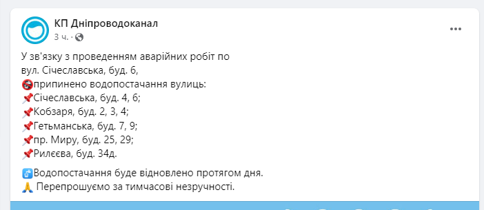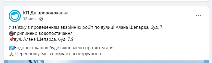 Так, роботи тривають на вул. Алана Шепарда, 7 та вул. Січеславська, 6, тому припинено водопостачання: