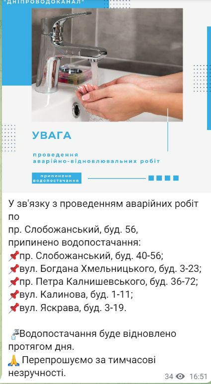 У п'ятницю, 21 квітня, деякі мешканці Дніпра залишилися без води.