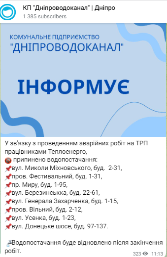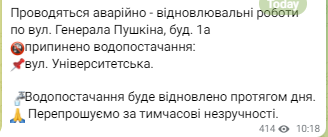 Крім того, у зв'язку з проведенням аварійних робіт на ТРП працівниками "Теплоенерго" припинено водопостачання:
